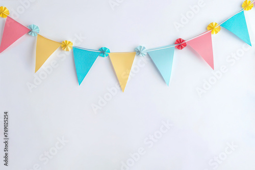 Colorful paper bunting banner with colorful triangular flags on white background. AI Generated