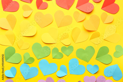 Colorful paper hearts on yellow background. Valentine's Day celebration