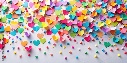 Colorful paper hearts scattered on a white background with confetti overlay in a playful and whimsical style
