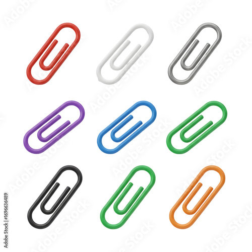 colorful paperclip set 3d illustration icon isolated on transparent background. red, metallic, white, black, purple, blue, green and orange paper clip. png