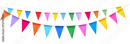 Colorful party bunting flags, festive decorative hanging triangular garland. Isolated on transparent background.