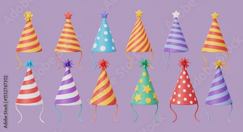 Colorful party hats arrayed on purple background for celebration and design