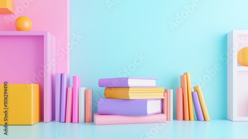 Colorful pastel bookshelf arrangement with stacked books and minimalist decor in vibrant modern interior design setting