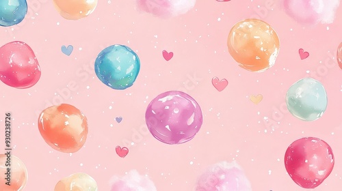 Colorful pastel bubbles and hearts on a soft pink background, creating a whimsical design.