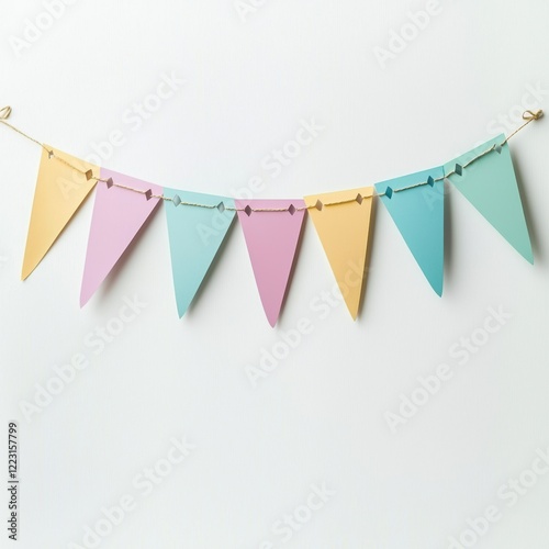 Colorful pastel bunting flags hanging on white background, creating festive and cheerful atmosphere