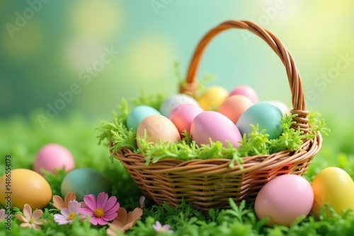 Colorful pastel Easter eggs in a spring basket overflowing with greenery , decoration, eggs, cheerful