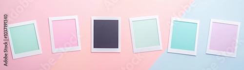 Colorful pastel frames in a row on a pink and blue background, showcasing a minimalistic and creative art composition.