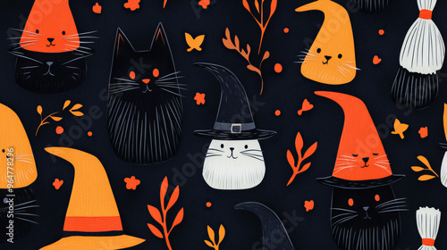 Colorful pattern featuring playful cats in hats surrounded by leaves and whimsical elements, perfect for Halloween decor.