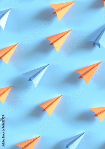 Colorful Pattern of Orange and Blue Paper Airplanes on Light Blue Background with Soft Shadows