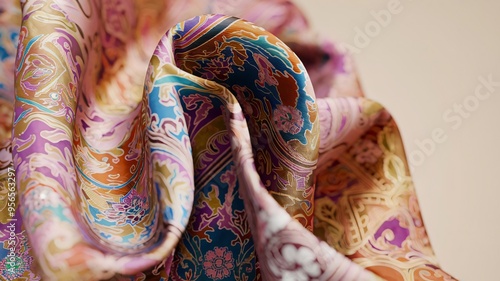 Colorful patterned silk scarf on white background, perfect for fashion or home decoration