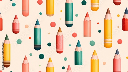 Colorful Pencils Pattern: A playful and vibrant pattern of multicolored pencils and polka dots creating a cheerful backdrop, perfect for stationery and creative projects.