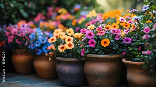 Colorful petunias in terracotta pots create a beautiful, vibrant display in a sunlit garden setting.