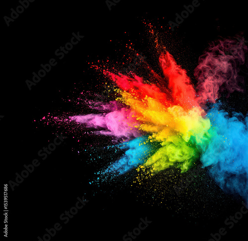 colorful pigment powder, explosion of colored powder exploding isolated on black background.