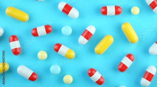 Colorful Pills and Capsules Spread on Bright Blue Surface Representing Health and Medicine Concepts