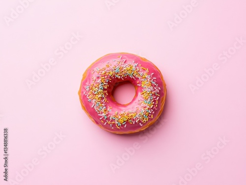 Colorful pink donut with sprinkles on pink surface.