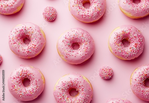 Colorful Pink Donuts with Sprinkles on a Soft Pink Background Ideal for Sweet Treats and Bakery Themes in Food Photography