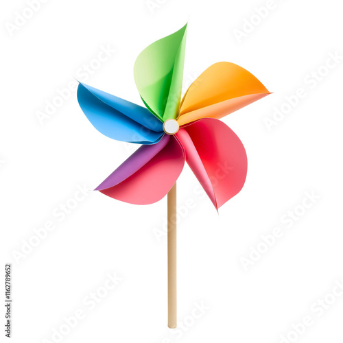 Colorful pinwheel toy on white background, origami windmill design illustration, childhood spinner decoration concept, playful paper fan element isolated