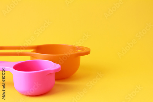 Colorful plastic measuring spoons and measuring cups on bright background with space for text