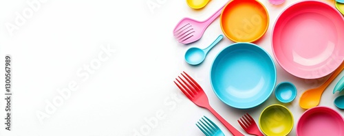 Colorful Plastic Tableware Arrangement Bowls Plates Spoons and Forks Delightful Kitchen Setting