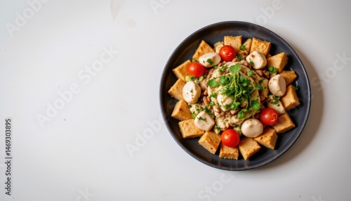 Colorful Platter of Tofu Salad with Cherry Tomatoes and Fresh Herbs on a Neutral Background