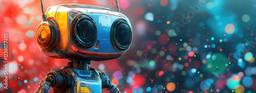 Colorful playful AI robot made of geometric shapes in a bright and lively setting with vibrant red, blue, and green splashes