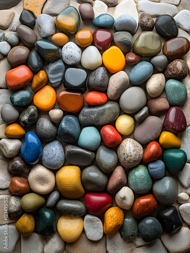 Colorful polished stones arranged on a light tile background; perfect for crafting, design, or meditation
