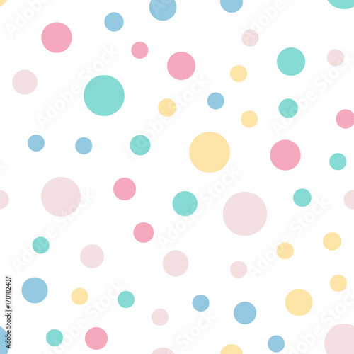 Colorful polka dots seamless pattern on white 9 background. Marvelous classic colorful polka dots textile pattern. Seamless scattered confetti fall chaotic decor. Abstract vector illustration.