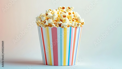 Colorful popcorn in striped container. A pile of fluffy popcorn rests in a vibrant, striped paper container, perfect for movie nights.