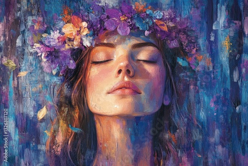 Colorful portrait of a woman with a floral crown and serene expression against an abstract background