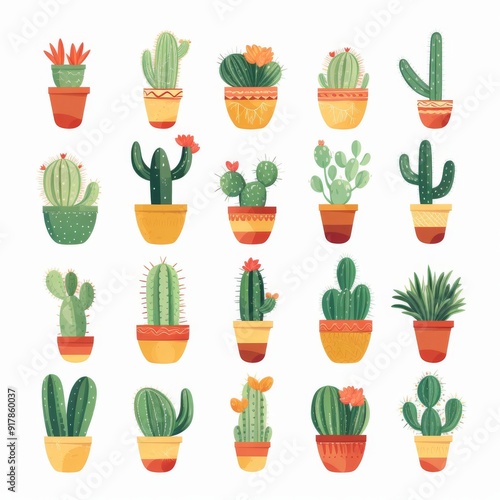 Colorful Potted Cacti and Succulents Illustration - Perfect for Nature Designs and Gardening Projects
