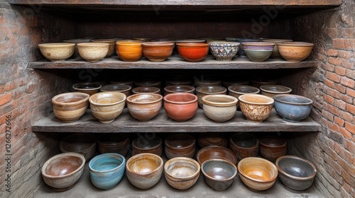 Colorful pottery bowls displayed on wooden shelves in a brick-walled workshop