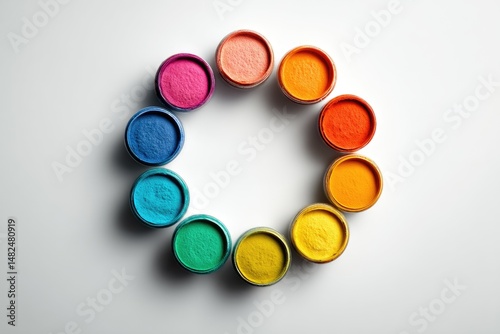 Colorful powder pigments arranged in a circle. Small, cylindrical containers holding vibrant hues form a circular pattern on a white surface