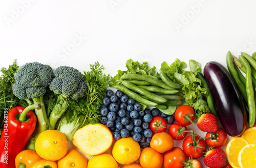 Colorful produce assortment for healthy eating and nutrition concepts: broccoli, oranges, tomatoes, blueberries and pepper. Isolated food image for diet, cooking, or grocery themes.