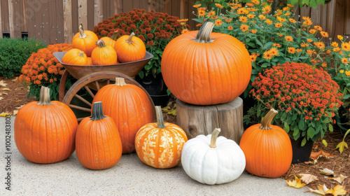 Colorful pumpkins arranged around vibrant flowers in a cozy autumn garden setting