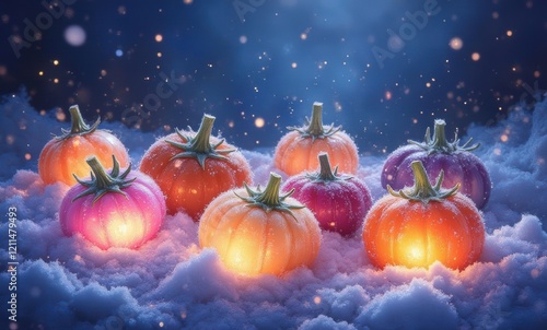 Colorful pumpkins glowing in snow