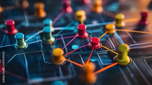 Colorful pushpins connected by string on a circuit board background, representing network connection.