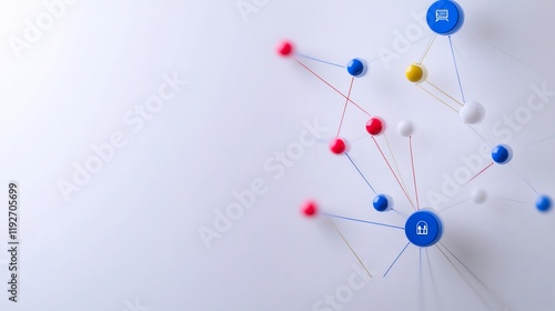 Colorful pushpins creatively connect forming a vibrant network on white background. AI Generated