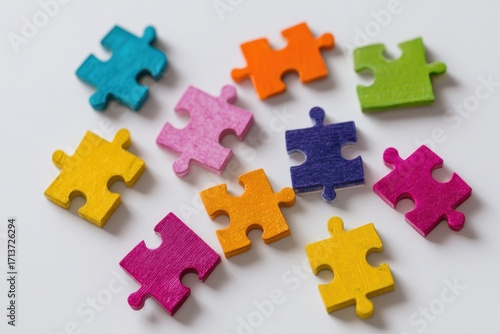 Colorful Puzzle Pieces Scattered on White Surface, Overhead View, Bright Light.