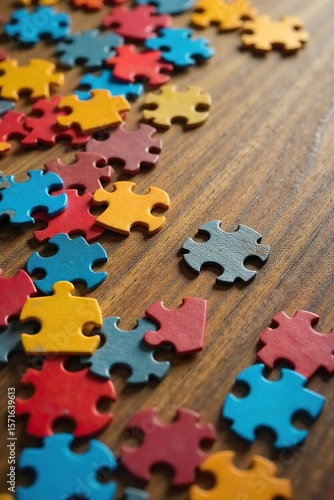 Colorful Puzzle Pieces Scattered on Wooden Background Abstract Unity and Creativity Concept