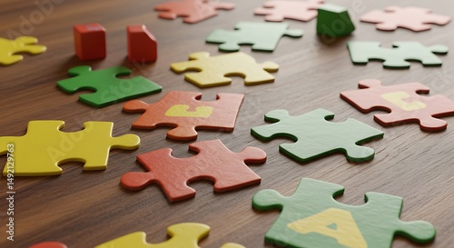 Colorful Puzzle Pieces Scattered on Wooden Surface Education Concept