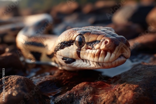 Colorful python rests on wet rocks by the river, showcasing scales as sunlight reflects off its body during early morning