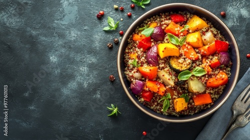 colorful quinoa salad with roasted vegetables in elegant bowl on dark background, top view of vibrant orange and red bell peppers contrasted with muted tones, fork as decoration in artistic food