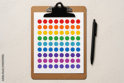 Colorful rainbow dot sticker mockup on clipboard paper with black pen for office planner organization school stationery design presentation background concept