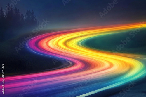 Colorful rainbow road stretches through green hills under a clear blue sky