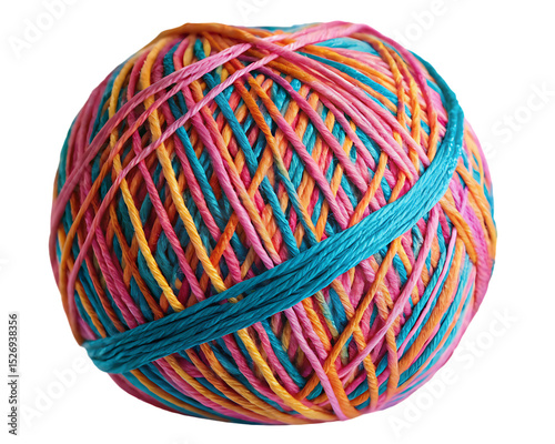 Colorful rainbow yarn ball with vibrant pink, turquoise, orange, and yellow threads, neatly wrapped for knitting or crafts, isolated on transparent background