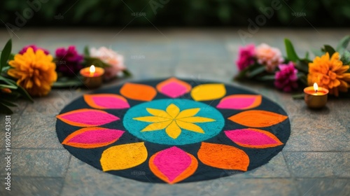 Colorful Rangoli Design with Powdered Colors Surrounded by Floral Decorations and Candles on a Stone Surface