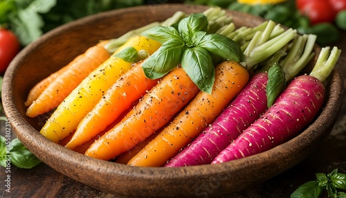 Colorful raw carrots in a wooden bowl with green basil leaves