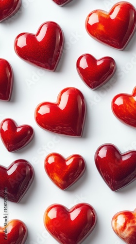 Colorful red heart-shaped chocolates arranged beautifully on a white background for a romantic occasion