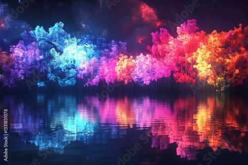 Colorful reflections of vibrant trees along a serene lake under a starlit sky at night creating a magical atmosphere