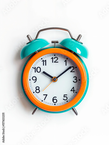 Colorful retro alarm clock with turquoise and orange accents on a white background